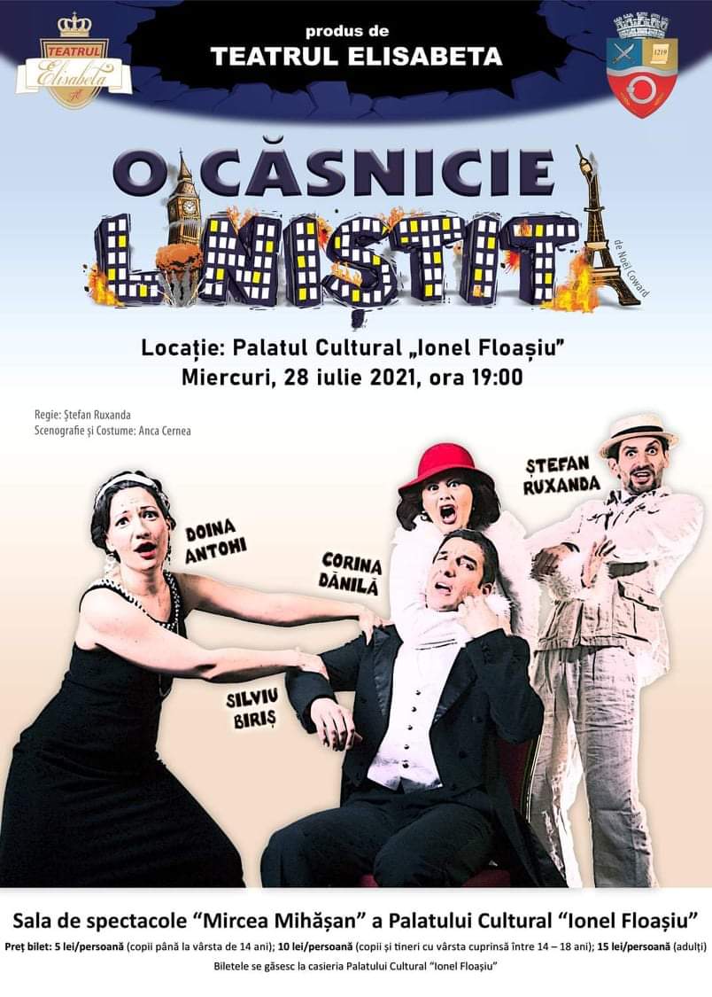 Primăria Câmpia Turzii și Teatrul Elisabeta din București vă invită la spectacol! Evenimentul va avea loc miercuri, 28 iulie 2021, de la ora 19:00, în Sala de Spectacole „Mircea Mihășan” a Palatului Cultural „Ionel Floașiu” din Municipiul Câmpia Turzii.