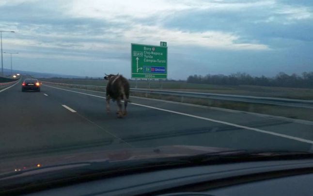 Un şofer care mergea pe autostradă, de la Aiud spre Turda, a surprins o vacă care alerga printre maşini.