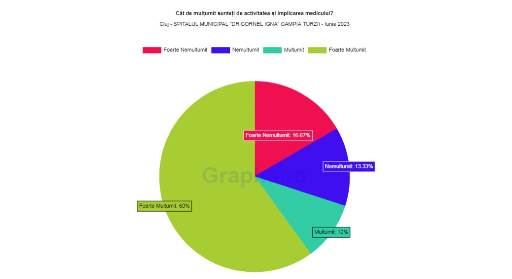 Dintre pacientii care au răspuns chestionarului în Iunie 2023, 70% se declară mulțumiți și foarte multumiți de activitatea și implicarea medicului din spital. Aceasta reprezintă totuși o scădere, -15.72% față de luna precedentă (Mai 2023), când procentul era de 85.72%.