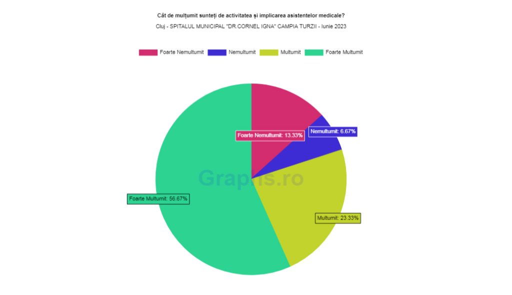 Dintre pacienții care au răspuns chestionarului, 80% se declară multumiți și foarte mulțumiți de activitatea și implicarea asistentelor medicale din spital. Aceasta reprezintă o scădere, -12.86% față de luna precedentă (Mai 2023), când procentul era de 92.86%.