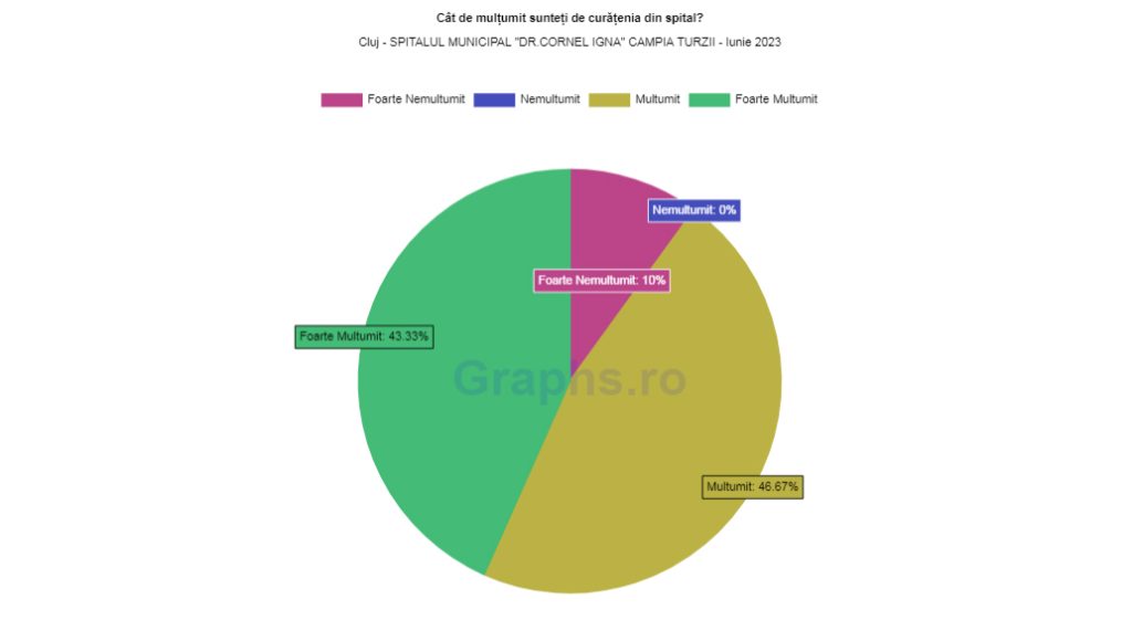 Dintre pacienții care au răspuns chestionarului în Iunie 2023, 90% se declară mulțumiți și foarte mulțumiți de curățenia din spital. Aceasta reprezintă o scădere, -2.86% față de luna precedentă (Mai 2023), când procentul era de 92.86%.