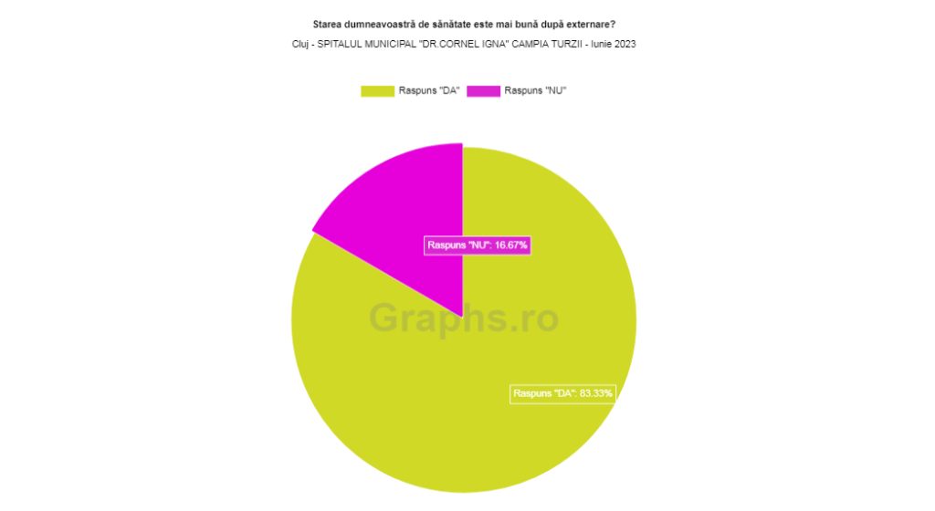 Dintre pacienții care au răspuns chestionarului în Iunie 2023, 83.33% au declarat că starea lor de sănatate este mai bună după externarea din spital. Aceasta reprezintă o scădere, -1.29% față de luna precedentă (Mai 2023), când procentul era de 84.62%.