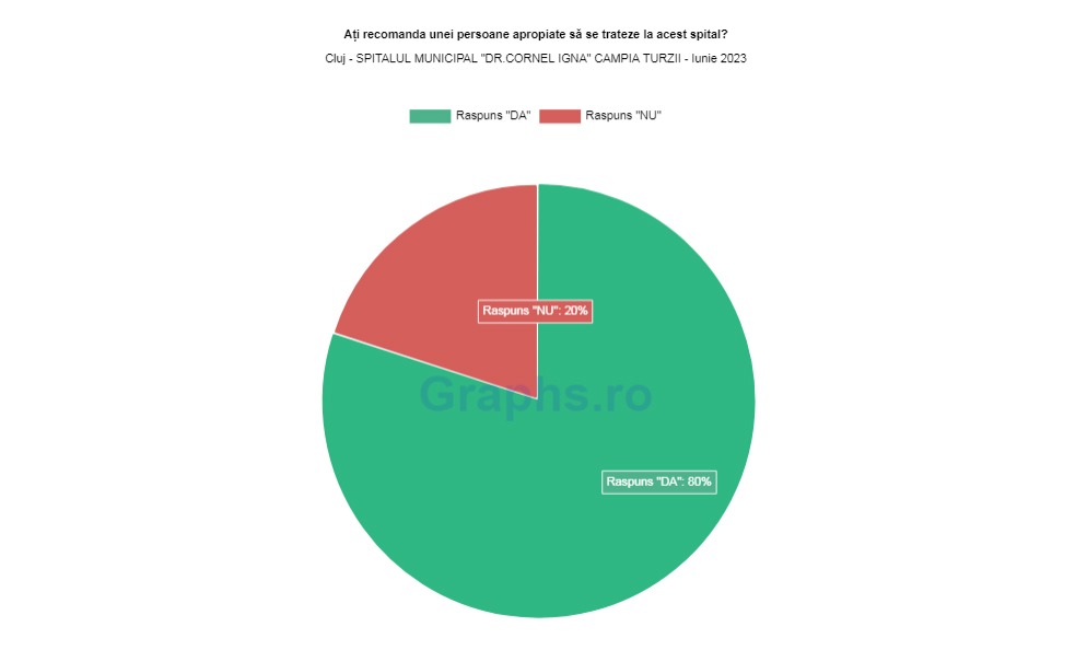 Dintre pacienții care au răspuns chestionarului în Iunie 2023, 80% au declarat că ar recomanda unei persoane apropiate să se trateze la spitalul din Câmpia Turzii. Aceasta reprezintă totuși o scădere, -12.31% față de luna precedentă (Mai 2023), când procentul era de 92.31%.