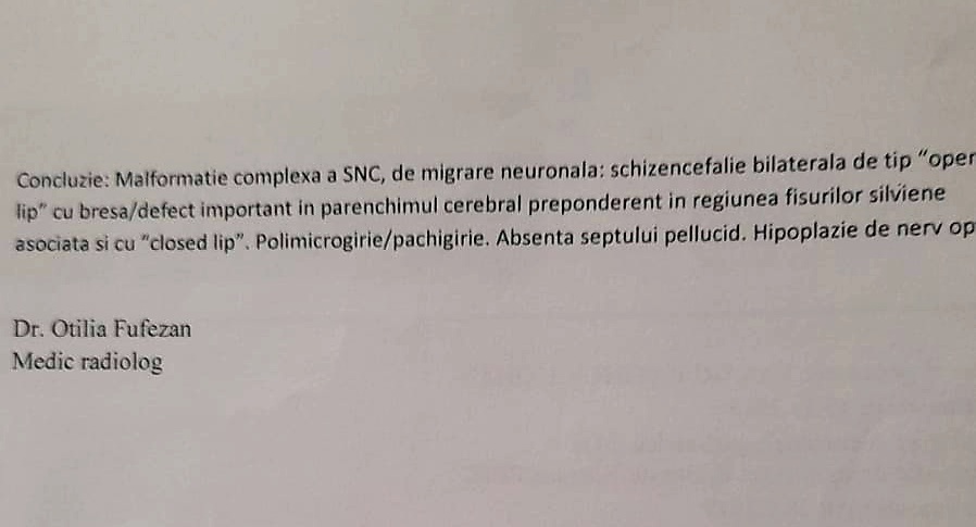 „Am fost cu el la medic la Cluj si mi-au prescris încă un tratament pe lângă ce are în momentul de față. Săptămâna viitoare mergem iar. Apoi, în noiembrie avem programare pentru internare. Doctorița la care am fost ne-a recomandat să îl ducem la clinică în Austria sau Germania. Facem in continuare kinetoterapie acasă. Pentru investigatii mai multe , ceea ce inseamnă costuri mari, pe care noi nu ni le permitem.