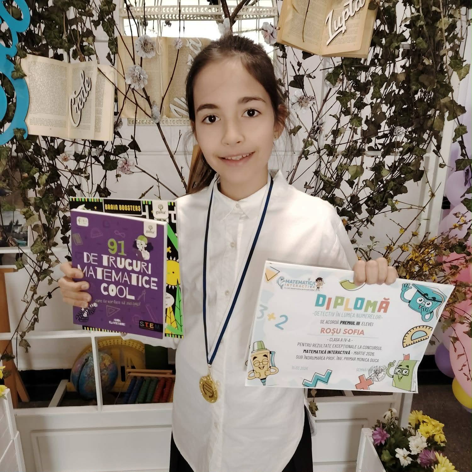 O nouă reușită remarcabilă pentru învățământul turdean vine din partea elevei Roșu Sofia, din clasa a IV-a C, de la Școala Gimnazială „Ioan Opriș”, care a obținut Premiul al III-lea la concursul „Matematica Interactivă”, desfășurat în luna martie 2026, la Cluj-Napoca.
