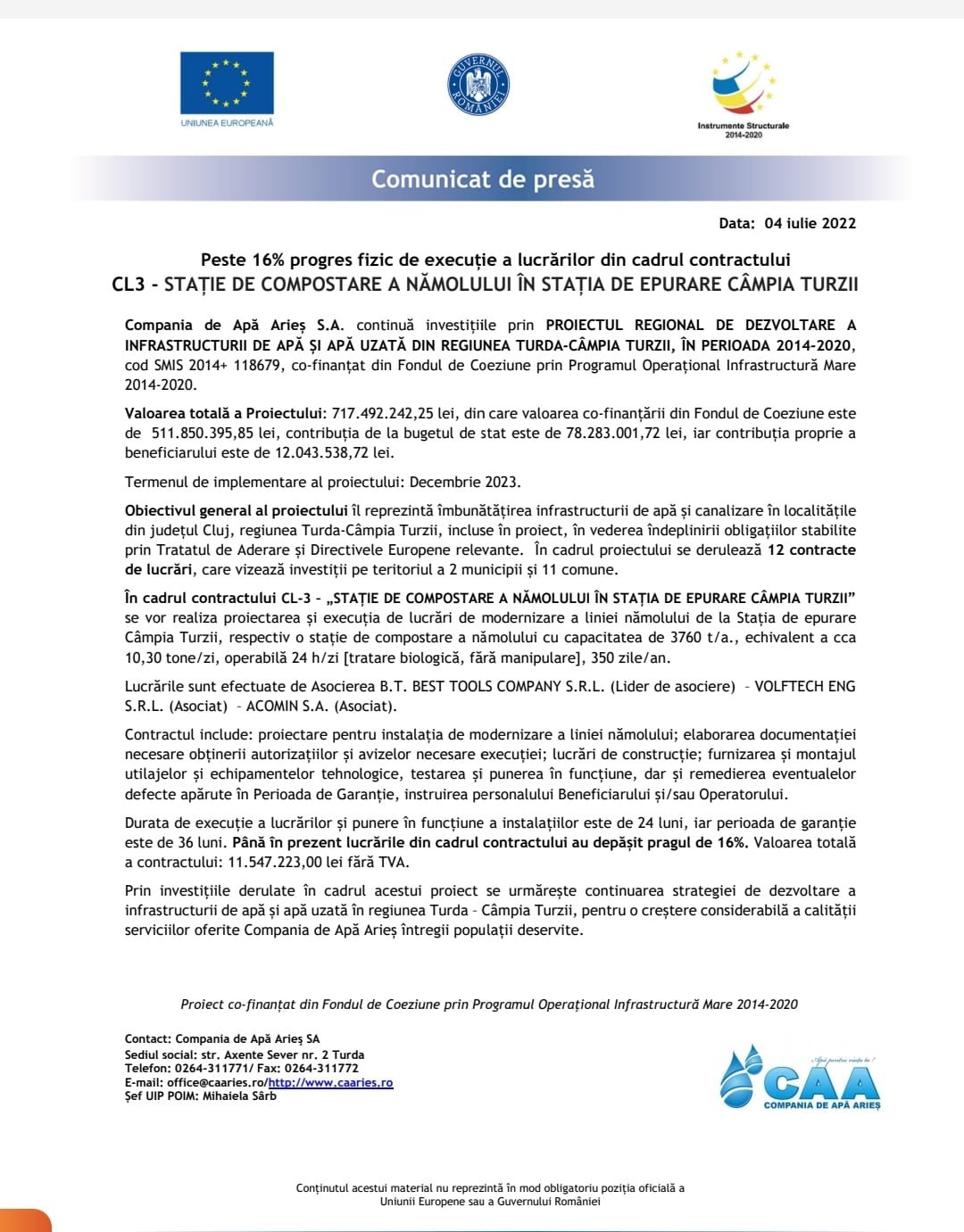 În cadrul contractului CL-3 – „STAȚIE DE COMPOSTARE A NĂMOLULUI ÎN STAȚIA DE EPURARE CÂMPIA TURZII”