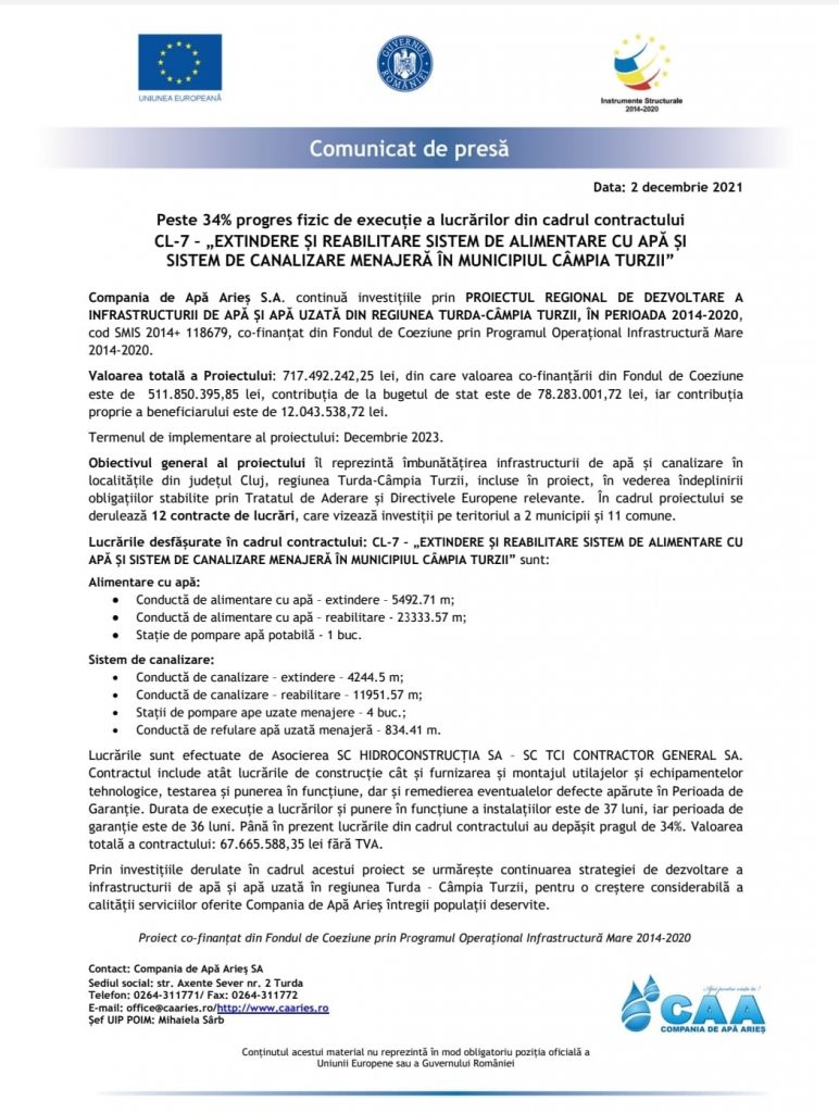 Compania de Apă Arieș S.A. continuă investițiile prin PROIECTUL REGIONAL DE DEZVOLTARE A INFRASTRUCTURII DE APĂ ȘI APĂ UZATĂ DIN REGIUNEA TURDA-CÂMPIA TURZII, ÎN PERIOADA 2014-2020, cod SMIS 2014+ 118679, co-finanțat din Fondul de Coeziune prin Programul Operațional Infrastructură Mare 2014-2020.