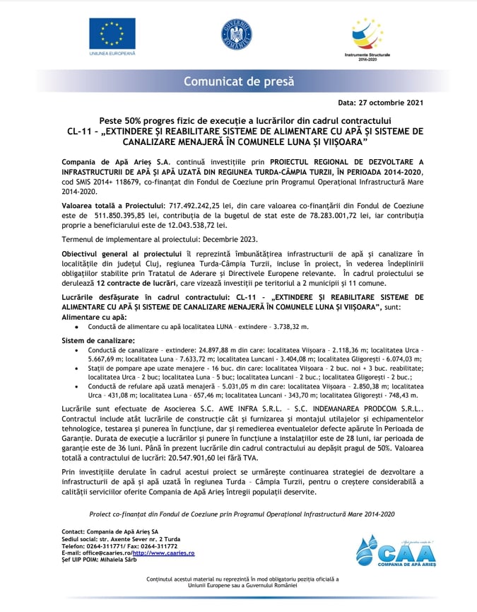ALIMENTARE CU APĂ ȘI SISTEME DE CANALIZARE MENAJERĂ ÎN COMUNELE LUNA ȘI VIIȘOARA”, sunt: