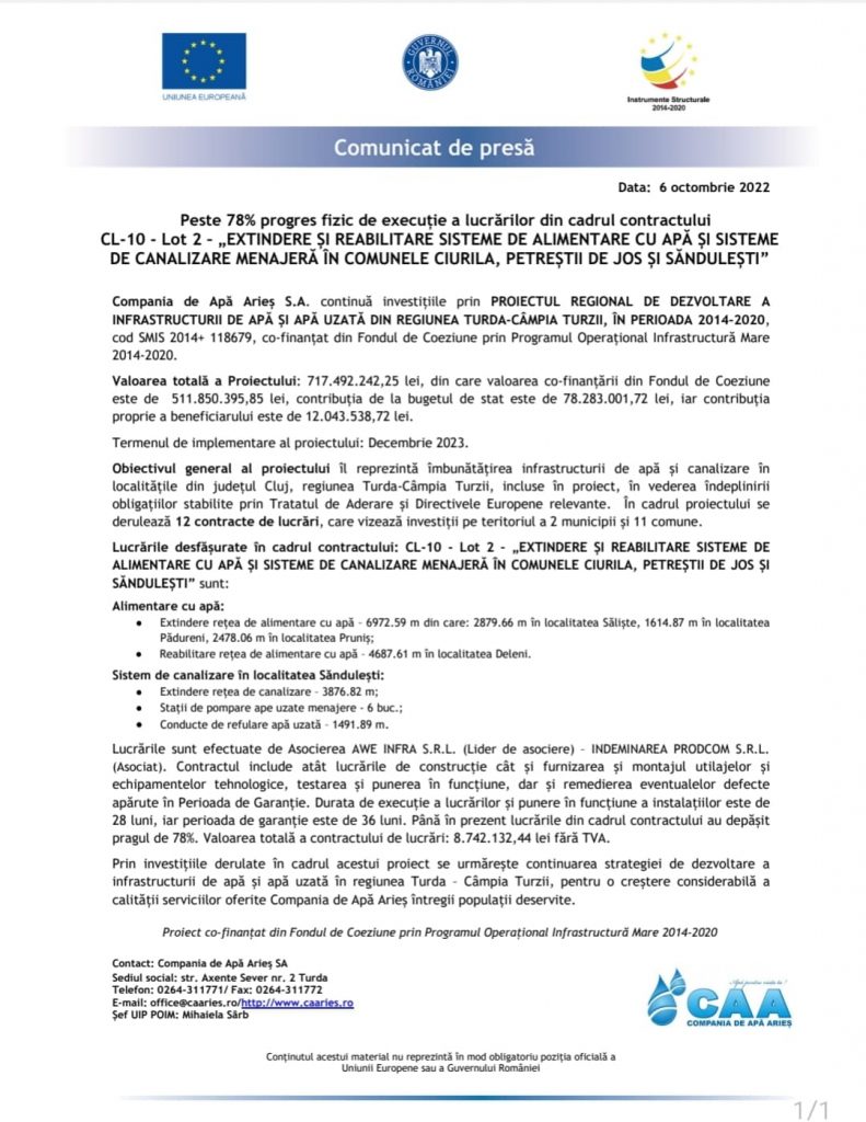 infrastructurii de apă și apă uzată în regiunea Turda – Câmpia Turzii, pentru o creștere considerabilă a