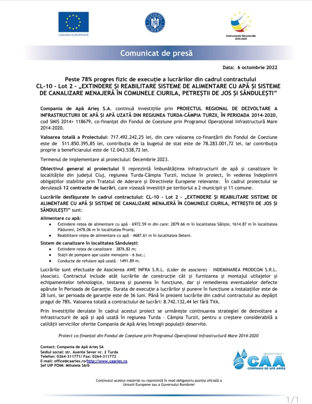 pragul de 78%. Valoarea totală a contractului de lucrări: 8.742.132,44 lei fără TVA.