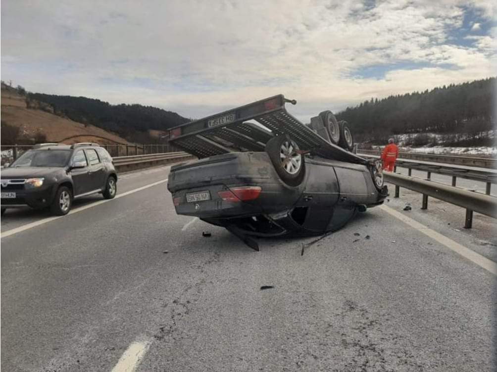 O platformă cu mașină pe ea s-au răsturnat pe Autostrada Transilvania, im această dimineață, pe sensul spre Cluj, la km 43.