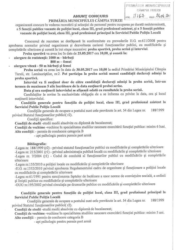 Poliția Locală Câmăpia Turzii scoate la concurs, în vederea recrutării și selecției de personal pentru ocuparea pe durată nedeterminată, 5 posturi de polițist local-asistent, 5 posturi polițist local-principal la Serviciul Public Poliția Locală.