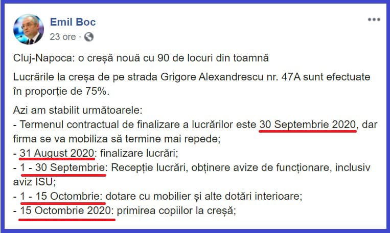 Recent Emil Boc, primarul municipiului Cluj Napoca a anunțat termenele de lucru pentru o creșă cu 90 de locuri. Lucrările la creșa amintită sunt terminate în proporție de 75%. Astfel Boc, a anunțat public următoarele termene limită pentru lucrările rămase de temrminat: