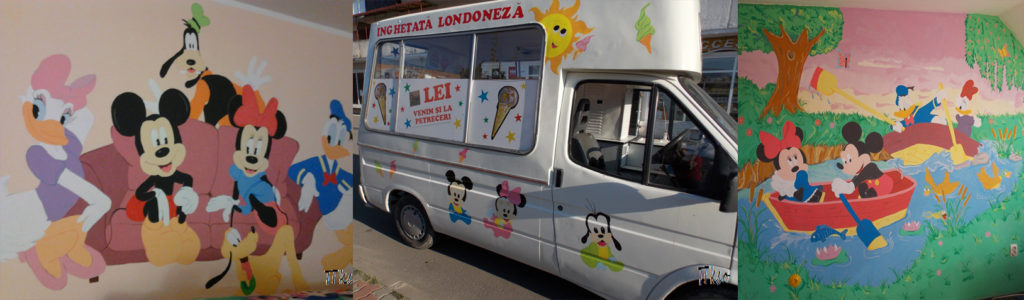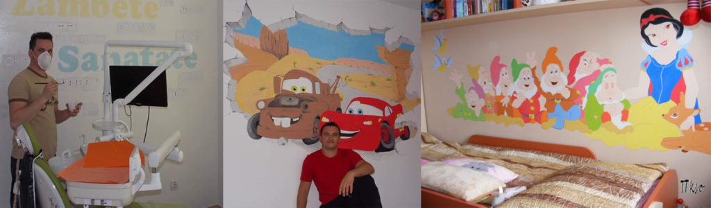 M.A.: Provocarea a fost ca o imagine A4 să o transpun pe un perete de 5-6 mp, aici intervine prima pasiune, matematica. Folosind cateva formule simple reușesc să reproduc o imagine la orice scală, restul ține de imaginație și foarte important de starea de spirit. Să nu uităm că pictura nu e o știință exactă, e o stare de spirit, o transpunere a unor trăiri, emoții. Materialele folosite sunt in funcție de suprafața pictată.. Picturile fiind realizate în case, majoritatea sunt realizate cu vopsea lavabilă, asta oferind unele avantaje : nu pătează, nu miroase, ușor de retușat, iar când vrei o schimbare e suficient să acoperi desenul cu un nou strat de vopsea. Folosesc însă și alte tipuri de vopsea: acrilice, emailuri etc.