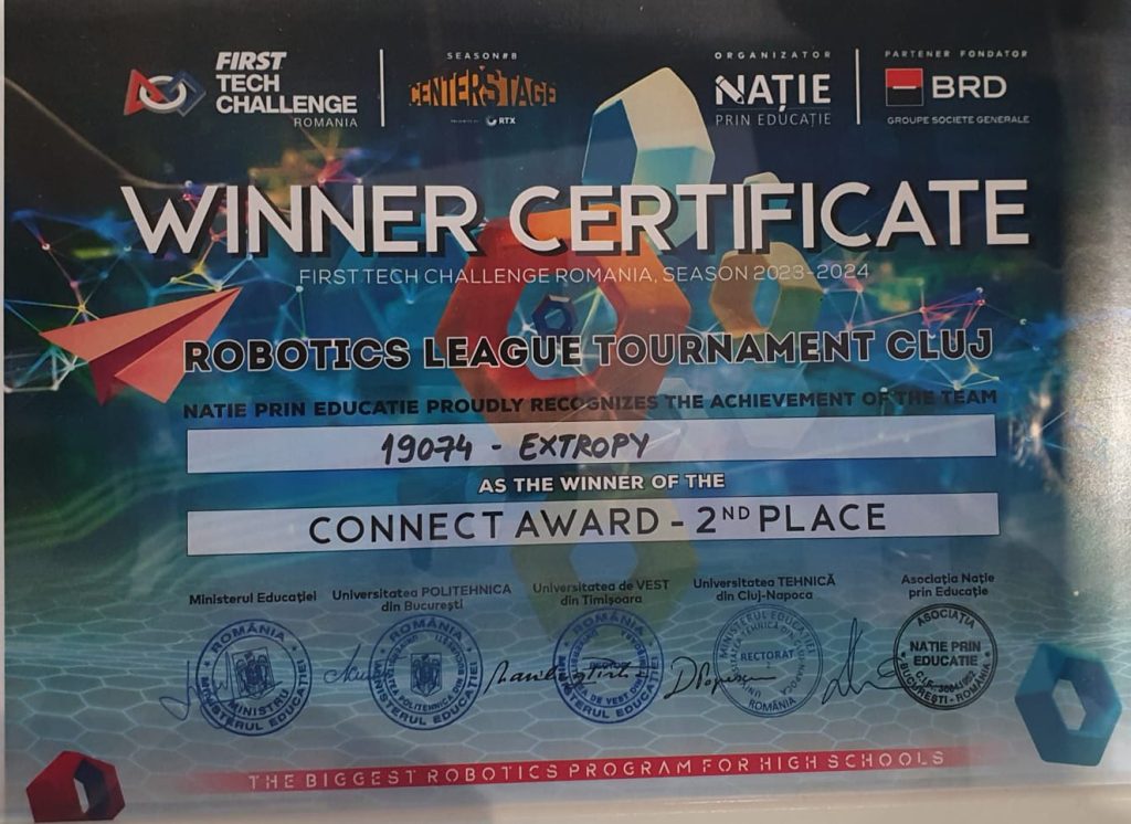 Premiul Connect- locul 2 pentru Extropy Robotics de la Liceul Teoretic Pavel Dan în cadrul Competiției Regionale First Tech