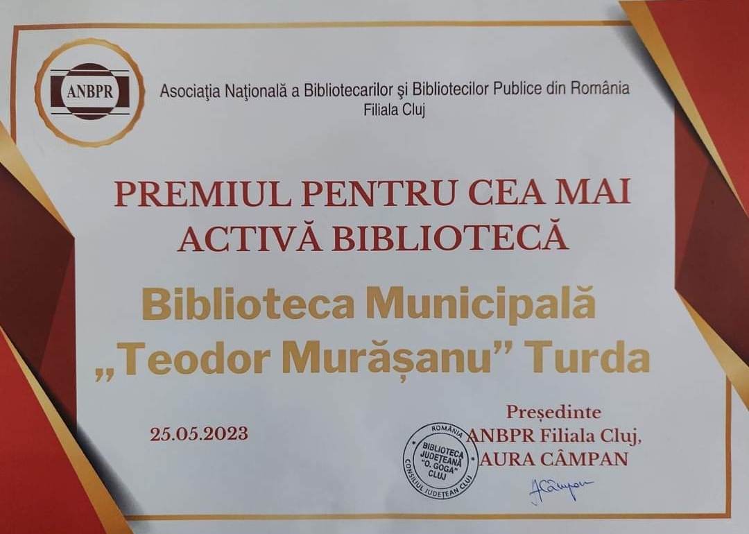 În ciuda faptului că anul 2022 a fost unul atipic pentru activitatea Bibliotecii Municipale ”Teodor Murășanu” Turda (Secția pentru copii din centru a fost închisă teporar începând din 2020, începutul anului 2022 a fost marcat de COVID19, iar a doua jumătate a anului de mutarea sediului central din clădirea teatrului), activitatea instituției noastre a fost apreciată la întâlnirea de ieri a bibliotecarilor din bibliotecile publice din județ când bibliotecii turdene i s-a decernat de către filiala Cluj a Asociației Naționale a Bibliotecilor Publice din România Premiul pentru cea mai activă bibliotecă.