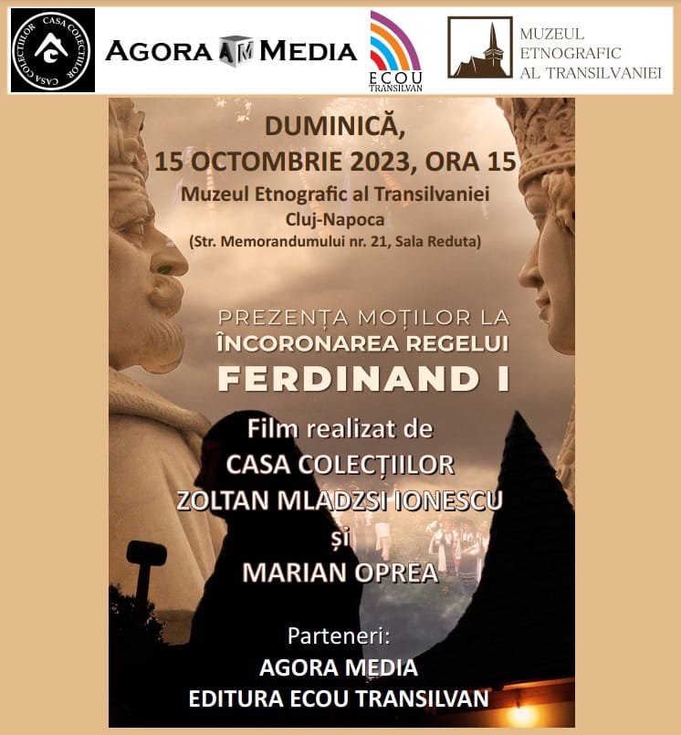 Muzeul Etnografic al Transilvaniei, instituție publică de cultură care funcționează sub autoritatea Consiliului Județean Cluj, împreună cu Asociatia ,,Casa Colectiilor’’ vă invită la vizionarea filmului documentar „Prezența Moților la încoronarea Regelui Ferdinand I”, care va avea loc duminică, 15 octombrie 2023, începând cu ora 15, la sediul Muzeului Etnografic al Transilvaniei (str. Memorandumului nr. 21).