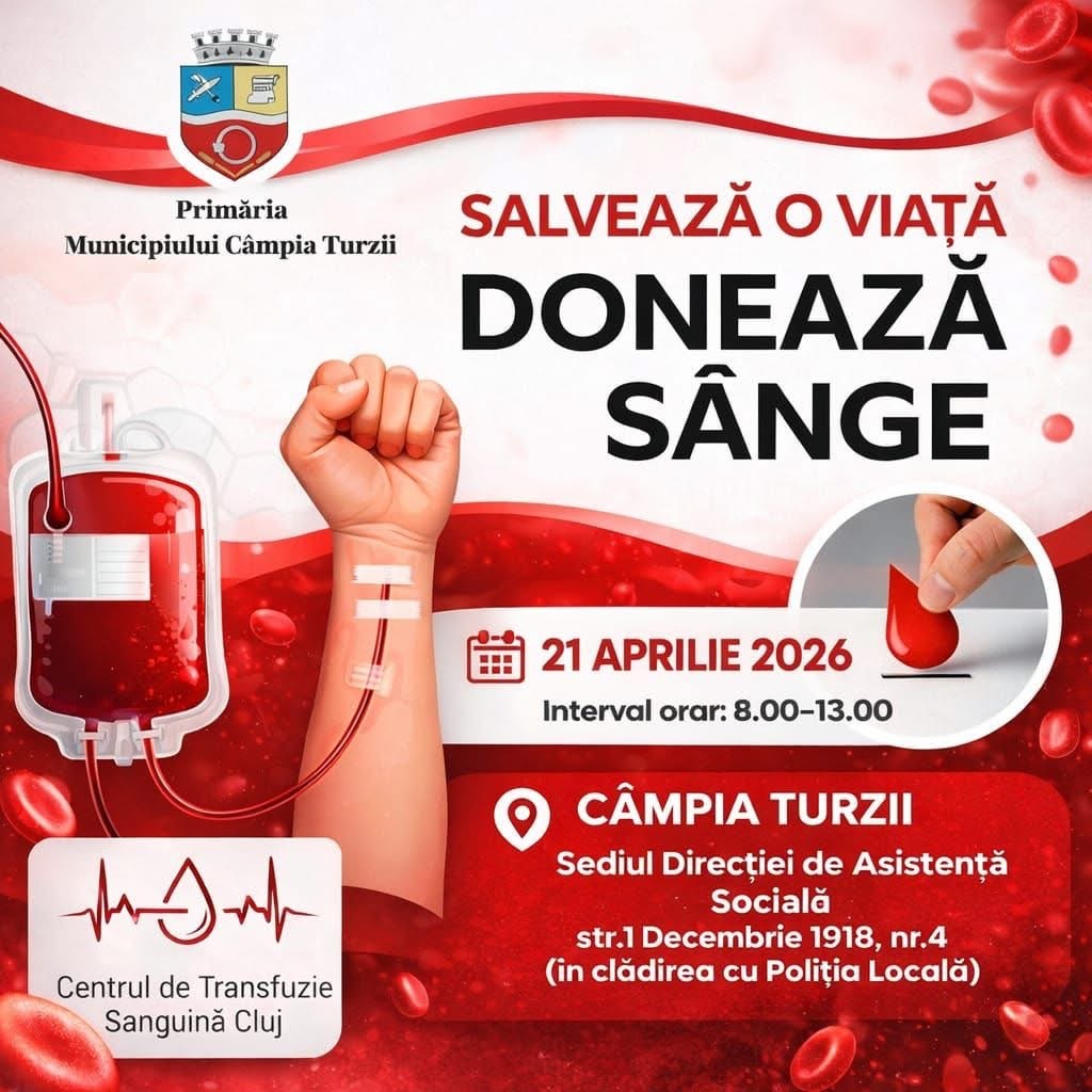 În data de 21 aprilie 2026, între orele 08:00 – 13:00, la sediul Direcției de Asistență Socială, situat pe strada 1 Decembrie 1918, nr. 4, vă așteptăm să donăm împreună sânge pentru cei aflați în nevoie.