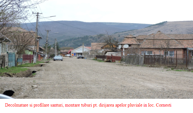 Decolmatare si profilare santuri, montare tuburi pt. dirijarea apelor pluviale in loc. Cornesti