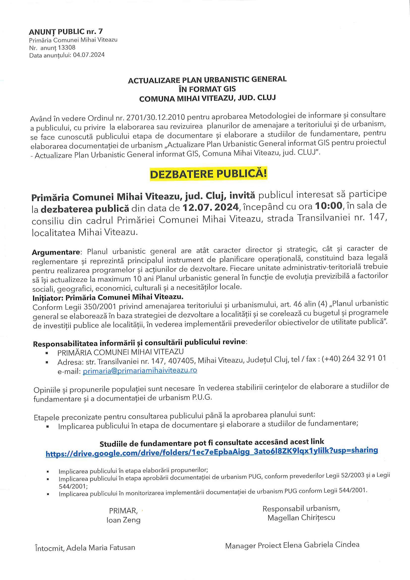📣📣📣Primăria Comunei Mihai Viteazu, jud. Cluj, invită toate persoanele interesate să participe la dezbaterea publică din data de 12.07.2024, începând cu ora 10:00, sala de consiliu din cadrul Primăriei Comunei Mihai Viteazu, județul Cluj.