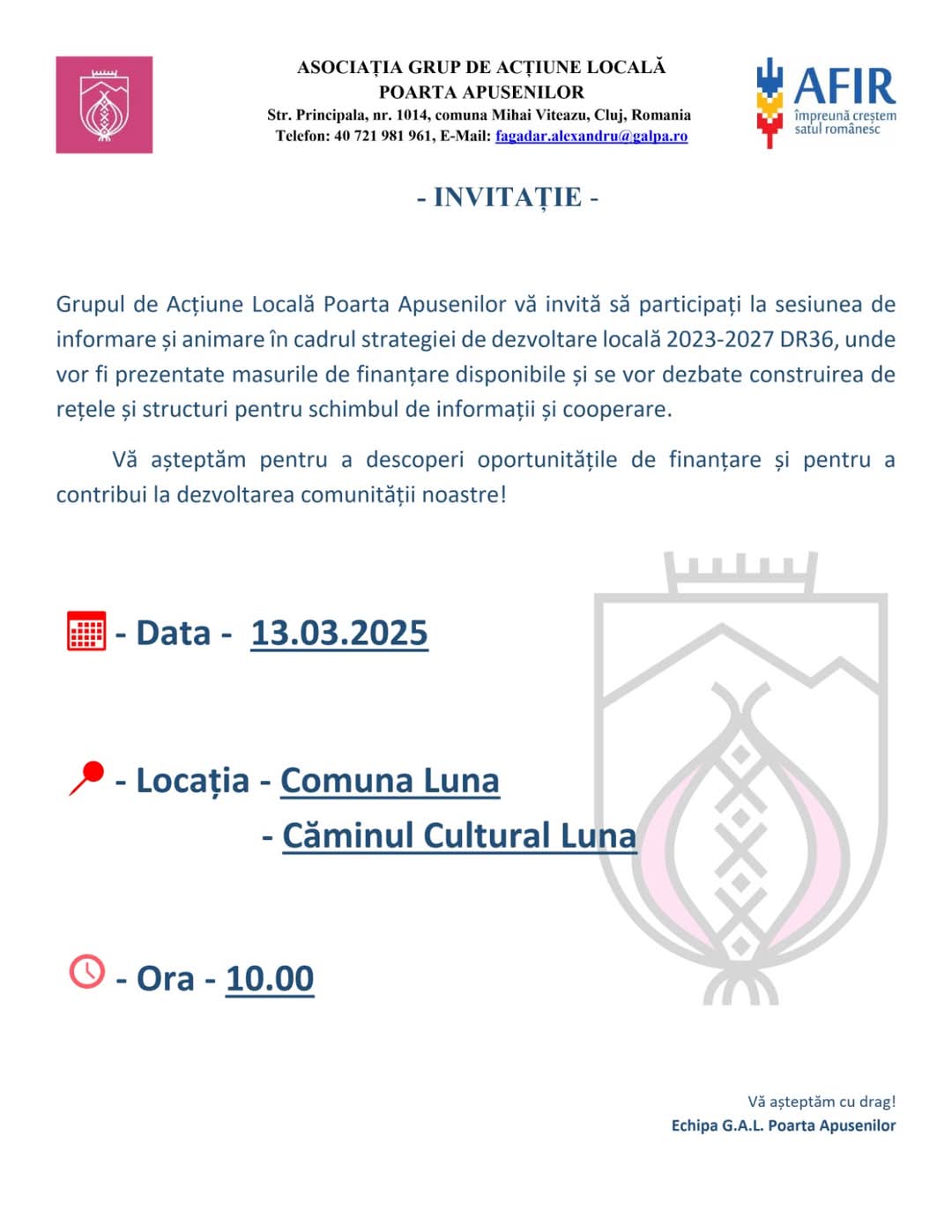Primăria comunei Luna, în parteneriat cu Grupul de Acțiune Locală Poarta Apusenilor, invită cetățenii, antreprenorii și toți cei interesați să participe la o sesiune de informare și animare privind strategia de dezvoltare locală 2023-2027 DR36. Evenimentul va avea loc pe 13 martie 2025, începând cu ora 10:00, la Căminul Cultural Luna.