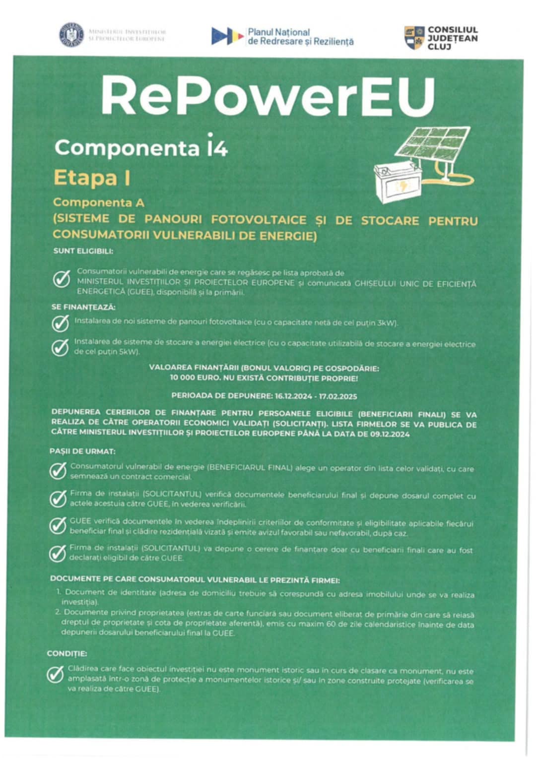 Depunerea cererilor de finațare pentru persoanele eligibile( beneficiari finali) se va realiza de către operatorii economici validați(solicitanți) Lista firmelor va fi publicată de către MINISTEUL INVESTIȚIILOR ȘI PROIECTELOR EUROPENE PÂNĂ LA DATA DE 09.12.2024.
