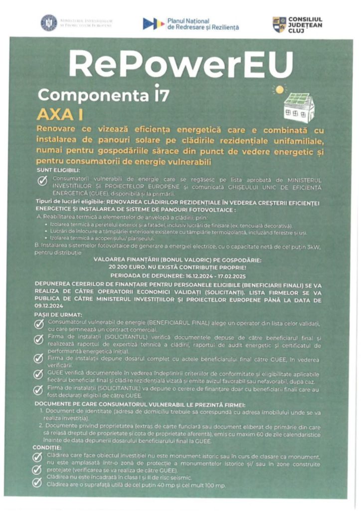 Se vor acorda finanțări din fondurile europene prin Planul National de Redresare și Reziliență (PNRR) aferente investițiilor 14 și 17 Componenta 16 RePowerEU. Astfel- Investiția 14 schema de granturi sub formă de bonuri valorice pentru accelerarea utilizării energiei din surse regenerabile de către gospodării; respectiv investiția : 7 Schema de granturi sub formă de bonuri valorice pentru îmbunătățirea eficientei energetice a gospodăriilor , Anexa I Renovare ce vizează eficiența energetică combinată cu instalarea de panouri solare pe clădirile rezidențiale unifamiliale, numai pentru gospodăriile sărace din punct de vedere energetic și pentru consumatorii de energie vulnerabili.