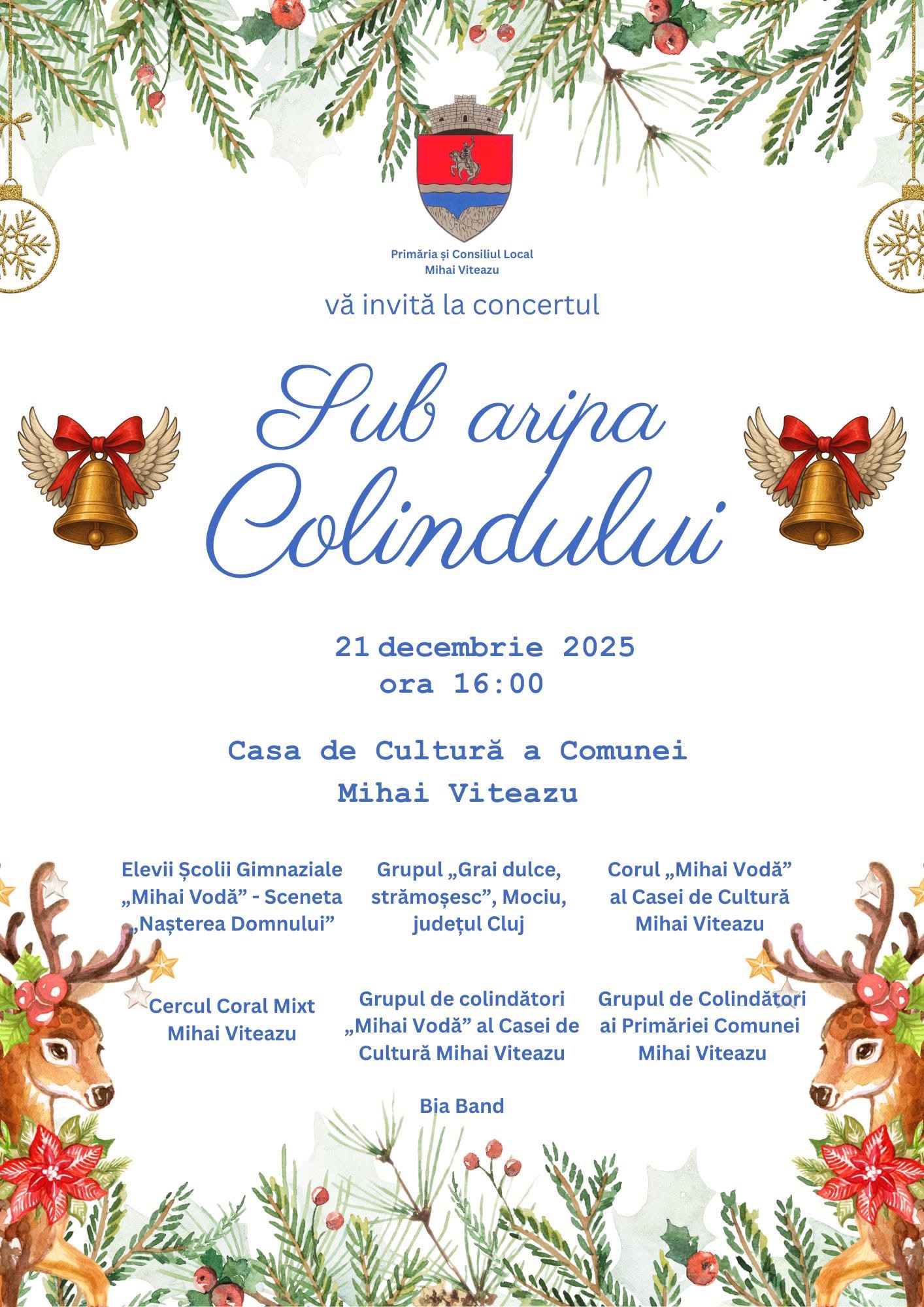 În suflet de sărbătoare, vă așteptăm duminică, 21 decembrie 2025, de la ora 16:00, la Casa de Cultură a Comunei Mihai Viteazu, pentru un concert dedicat tradiției, credinței și frumuseții colindului românesc.