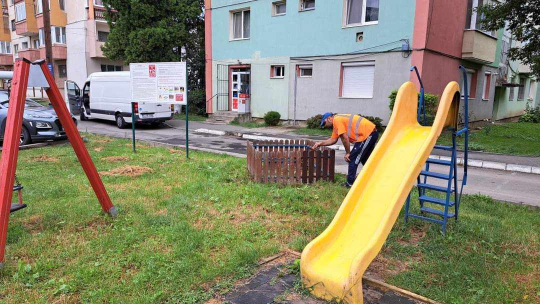 Echipele de la Domeniul Public și-au concentrat eforturile pentru a îngriji parcurile din oraș. Astfel, pe lângă activitățile de cosire și toaletare a spațiilor verzi, care se realizează zilnic, astăzi s-a intervenit pentru repararea și vopsirea ansamblurilor de joacă.