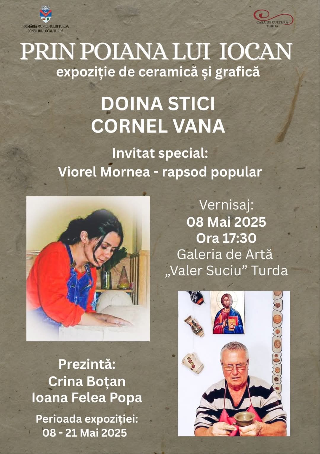 Doina Stici ne va cuceri cu lucrări ceramice expresive, în care forma și culoarea devin limbaj vizual, iar artistul Cornel Vana ne invită în universul său grafic și ne surprinde totodată cu o colecție aparte de ceramică.