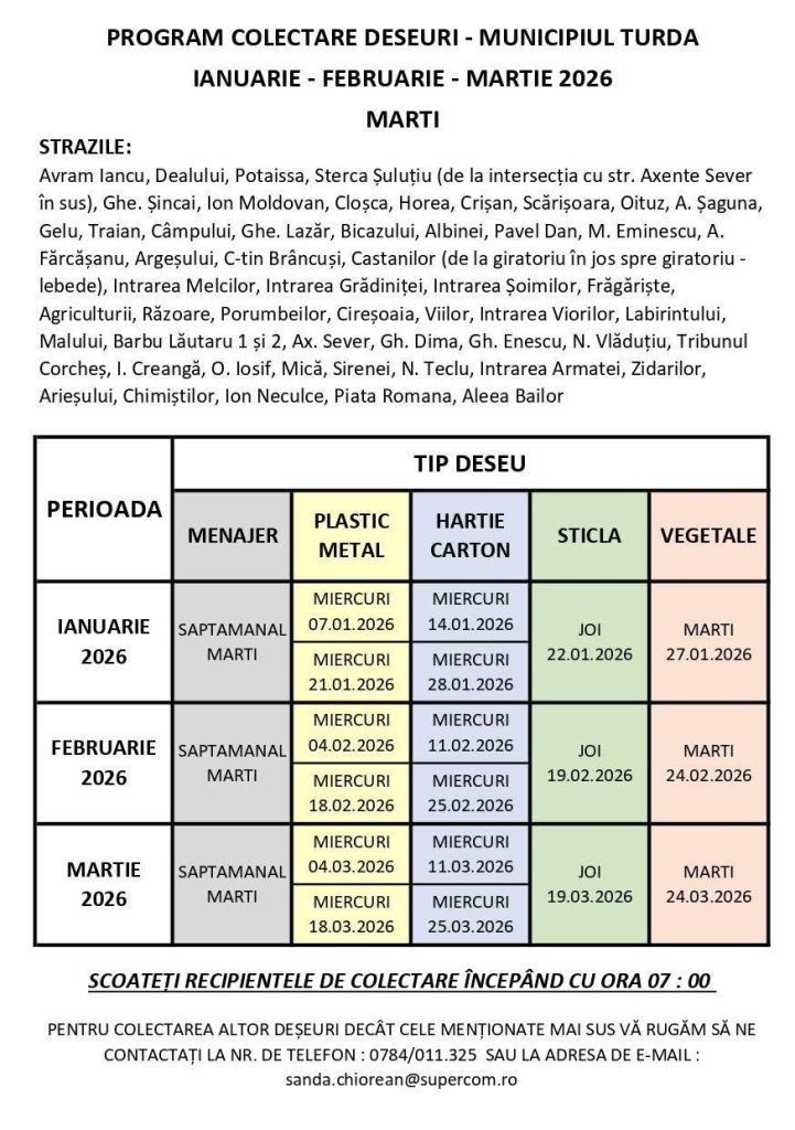 A fost stabilit programul de colectare a deșeurilor pentru primul trimestru al anului 2026, organizat pe zile de colectare și străzi arondate.