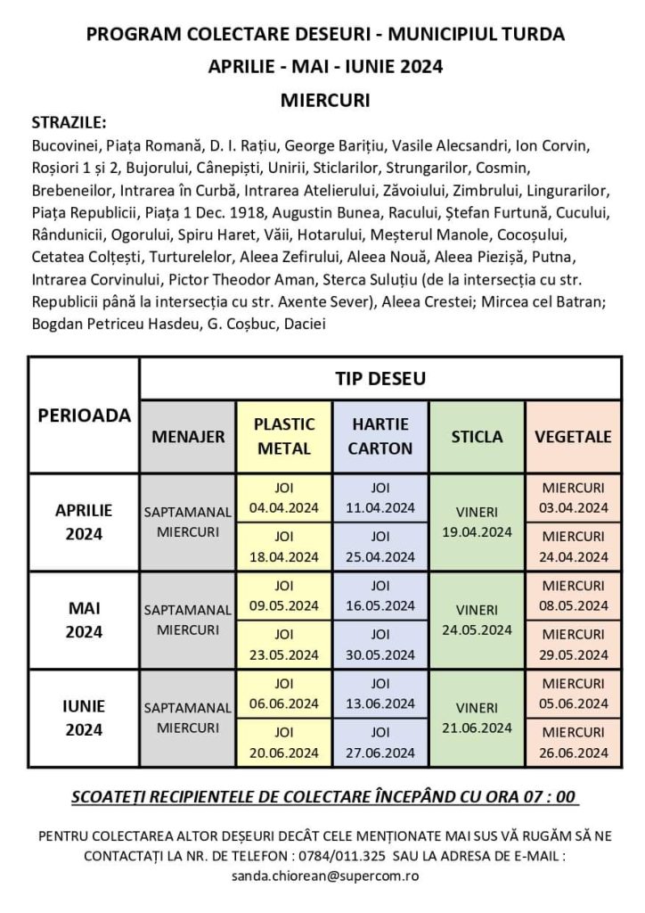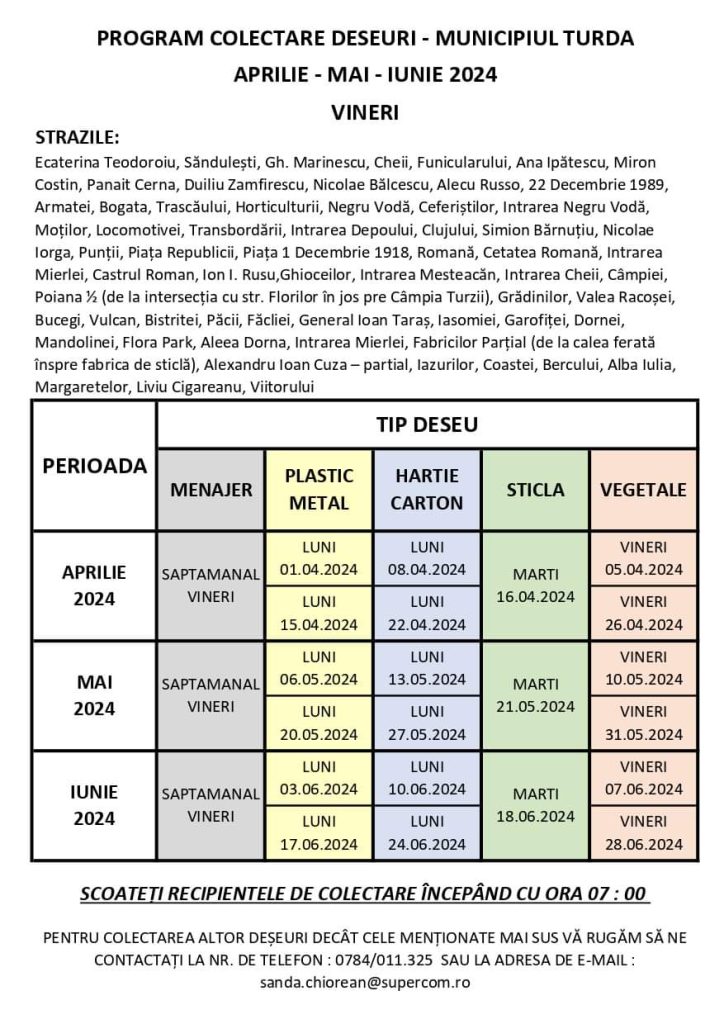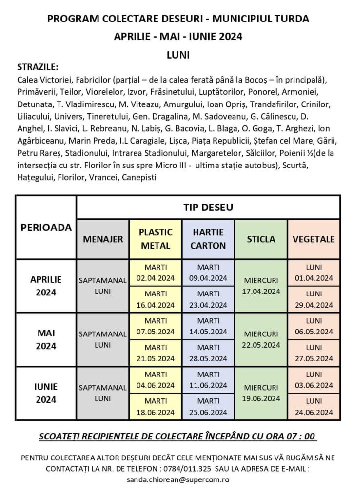 Pentru informații/sesizări cu privire la serviciile companiei de salubritate SUPERCOM îi puteți contacta la adresa de mail turda@supercom.ro sau telefonic: 0784.011.325.