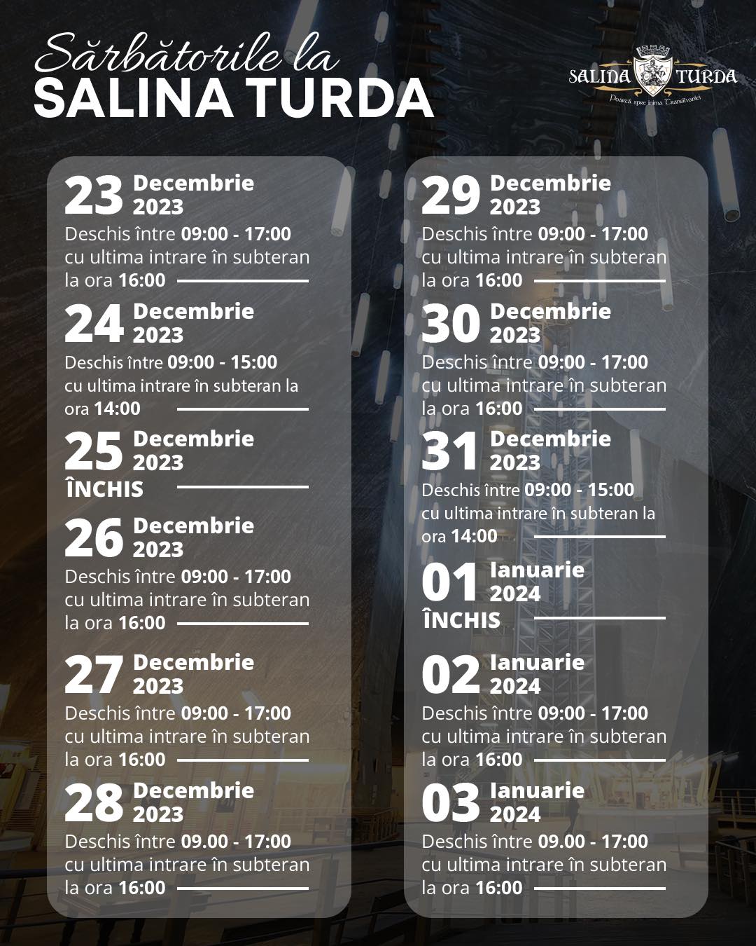 27 Decembrie 2023 – deschis între 09.00 – 17:00 cu ultima intrare în subteran la ora 16:00