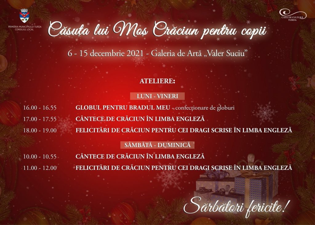 De asemenea,în perioada 6-15 decembrie 2021, Galeria de Artă din Turda devine lumea fermecată a lui Moș Crăciun, unde copiii vor participa la ateliere și vor putea admira Salonul de Iarnă al pictorilor de la Asociația Culturală ,,Filarmonia,, Turda.