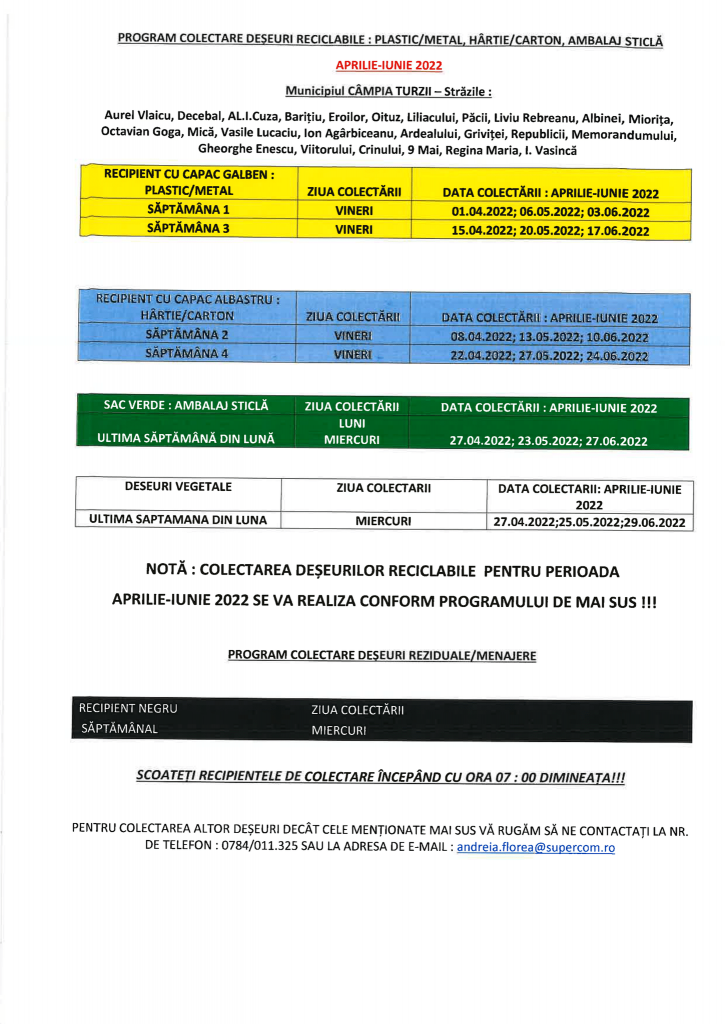Actualitate Programul de colectare a deșeurilor, în Municipiul Câmpia Turzii, în perioada aprilie – iunie 2022 ziarul21.ro 6 aprilie 2022, 13:09 Share Tweet Share Share Email Comments Related Items:Featured, în municipiul Câmpia Turzii, în perioada aprilie - iunie 2022, Programul de colectare a deșeurilor Share Tweet Share Share Email Recommended for you Programul de colectare a deșeurilor menajere și reciclabile, în Municipiul Câmpia Turzii, în perioada octombrie – decembrie 2025 Programul de colectare al deșeurilor menajere și reciclabile, în Municipiul Câmpia Turzii, în perioada ianuarie – martie 2025 Programul de colectare a deșeurilor menajere și reciclabile, în Municipiul Câmpia Turzii, în lunile Iulie, August și Septembrie Click to comment Leave a Reply Anulează răspunsulComentariile trebuie să respecte regulile de utilizare.Adresa ta de email nu va fi publicată. Câmpurile necesare sunt marcate cu *Comentariu * Nume * Email * Δ Acest site folosește Akismet pentru a reduce spamul. Află cum sunt procesate datele comentariilor tale.