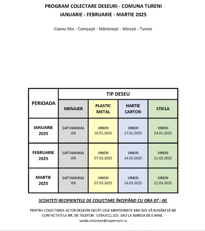 Primăria Comunei Tureni vă aduce la cunoștință programul de colectare a deșeurilor menajere și reciclabile pentru lunile ianuarie, februarie și martie 2025.