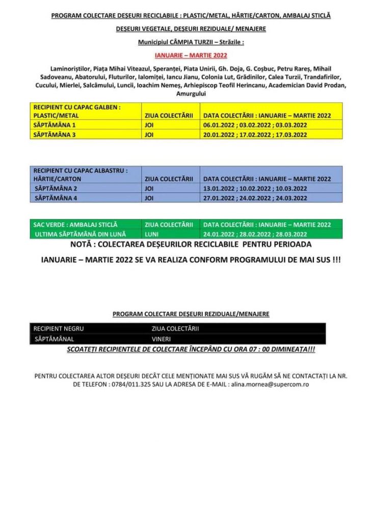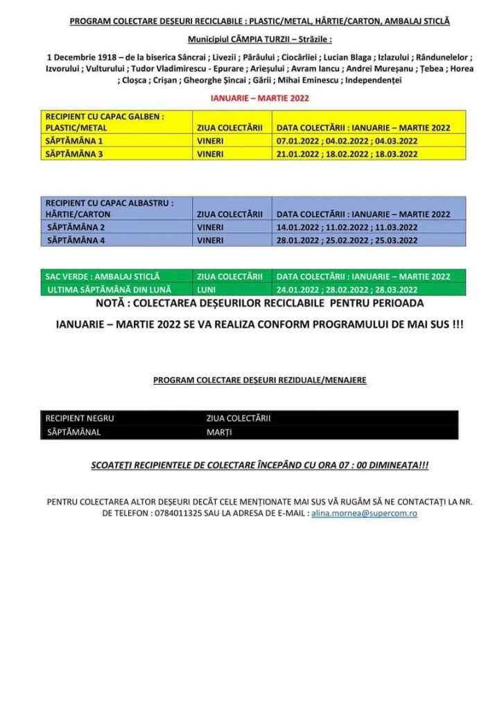 Actualitate Programul de colectare a deșeurilor, pe raza Municipiului Câmpia Turzii, în perioada ianuarie-martie 2022 ziarul21.ro 12 ianuarie 2022, 11:15 Share Tweet Share Share Email Comments Related Items:Featured, în perioada ianuarie-martie 2022, pe raza Municipiului Câmpia Turzii, Programul de colectare a deșeurilor, ziarul 21 Share Tweet Share Share Email Recommended for you Investiții majore pentru eficiență energetică la Școala Gimnazială Frata, printr-un proiect finanțat de AFM Cristian Matei: “Când Turda mută… e ȘAH MAT la nivel național! 𝐀𝐜𝐭̦𝐢𝐮𝐧𝐢 𝐝𝐞 𝐝𝐞𝐬𝐳𝐚̆𝐩𝐞𝐳𝐢𝐫𝐞 𝐬̦𝐢 𝐜𝐨𝐦𝐛𝐚𝐭𝐞𝐫𝐞 𝐚 𝐩𝐨𝐥𝐞𝐢𝐮𝐥𝐮𝐢 𝐩𝐞 𝐝𝐫𝐮𝐦𝐮𝐫𝐢𝐥𝐞 𝐣𝐮𝐝𝐞𝐭̦𝐞𝐧𝐞 Click to comment Leave a Reply Anulează răspunsulComentariile trebuie să respecte regulile de utilizare.Adresa ta de email nu va fi publicată. Câmpurile necesare sunt marcate cu *Comentariu * Nume * Email * Δ Acest site folosește Akismet pentru a reduce spamul. Află cum sunt procesate datele comentariilor tale.