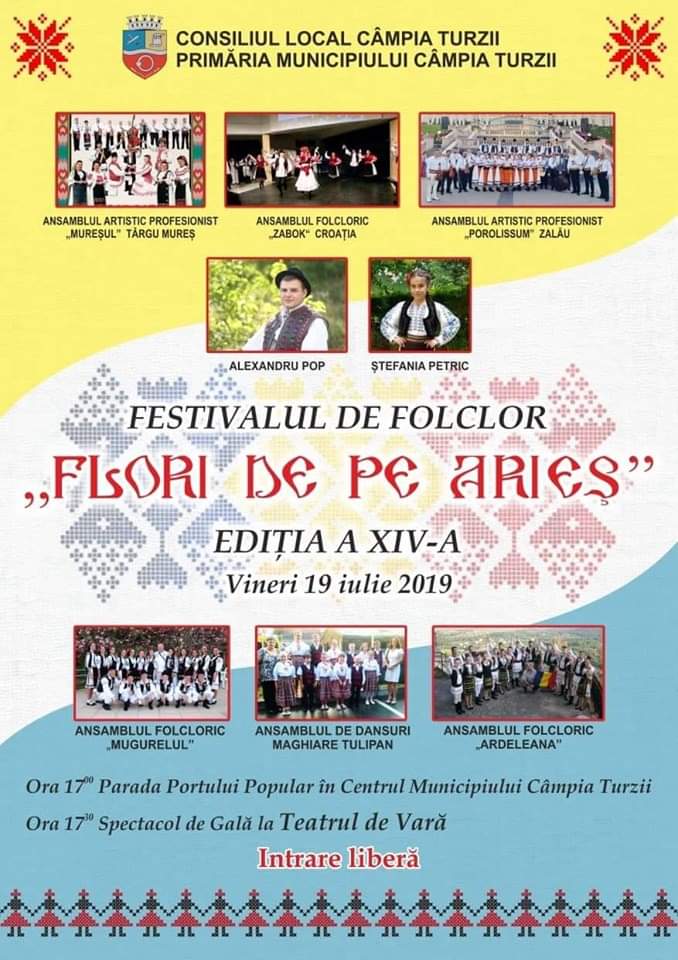 Vineri, 19 iulie 2019, de la ora 17:00 va avea loc cea de-a XIV-a ediție a festivalului de folclor „Flori de pe Arieș”. Acesta va debuta cu „Parada Portului Popular”, astfel că începând cu ora 17:00, ansamblurile participante vor defila din fața sediului Impozite și Taxe Locale spre Primăria Municipiului Câmpia Turzii și până la Piața Tricolorului, în următoarea ordine: