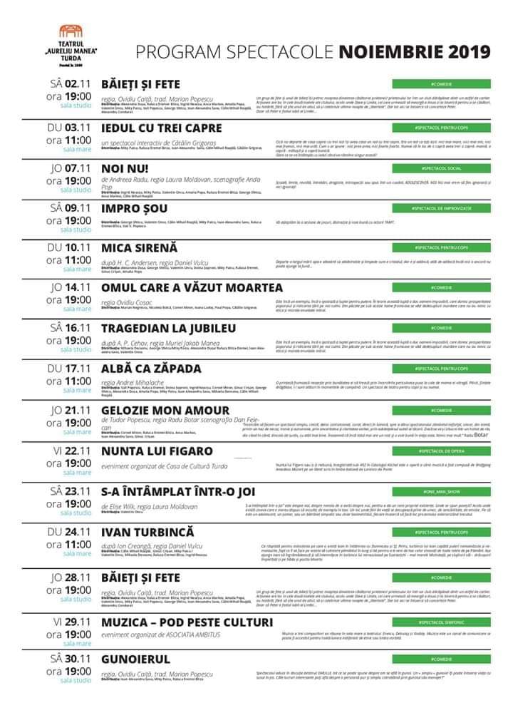 Actualitate Programul Teatrului Aureliu Manea, Turda pentru luna Noiembrie 2019 ziarul21.ro 30 octombrie 2019, 13:21 Share Tweet Share Share Email Comments Spectacole memorabile, spectacole pentru copii, spectacole de improvizație, comedii savuroase, toate își găsesc loc în programul lunii noiembrie la Teatrul Aurelia Manea Turda. Vă invităm la teatru! Related Items:Featured Share Tweet Share Share Email Recommended for you Noii polițiști ai IPJ Cluj, instruiți în comunicarea cu cetățenii: profesionalismul începe cu dialogul BĂRBAT URMĂRIT NAȚIONAL DEPISTAT DE POLIȚIȘTI ÎN CLUJ Se începe sterilizarea și microciparea câinilor din comuna Mihai Viteazu Click to comment Leave a Reply Anulează răspunsulComentariile trebuie să respecte regulile de utilizare.Adresa ta de email nu va fi publicată. Câmpurile necesare sunt marcate cu *Comentariu * Nume * Email * Δ Acest site folosește Akismet pentru a reduce spamul. Află cum sunt procesate datele comentariilor tale.