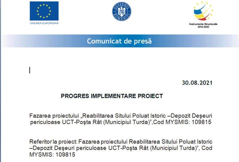 Referitor la proiect: Fazarea proiectului Reabilitarea Sitului Poluat Istoric –Depozit Deşeuri periculoase UCT-Poşta Rât (Municipiul Turda)”, Cod MYSMIS: 109815