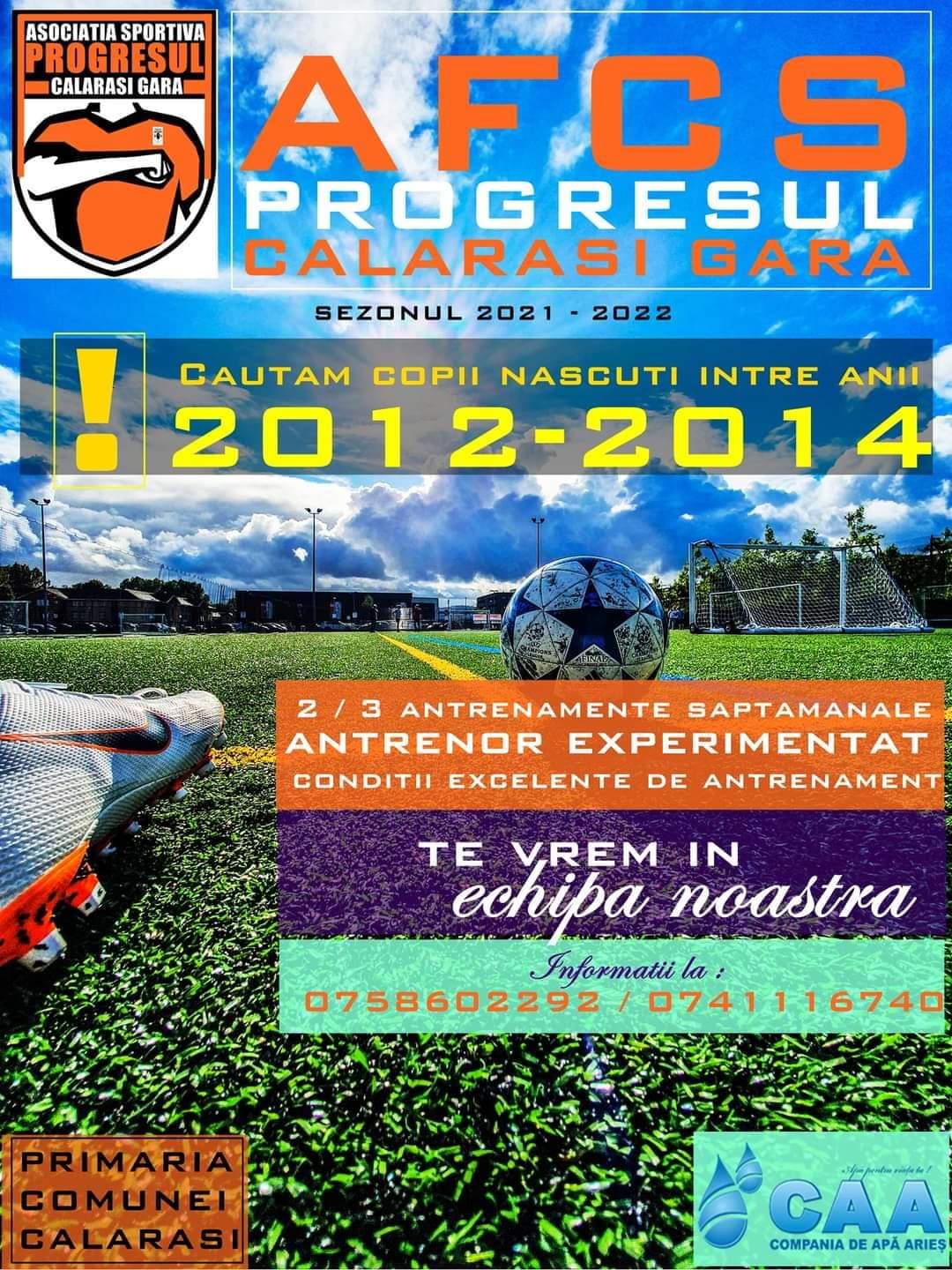 „AFCS Progresul Călărași Gară invită și caută copii născuți între anii 2012 – 2014 (băieți și fete) care să facă parte din grupa de sub 10 a echipei noastre.