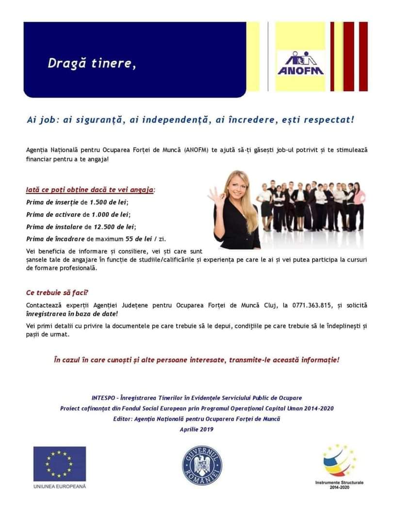 Agenţia Naţională pentru Ocuparea Forţei de muncă (ANOFM) te ajută să-ţi găseşti job-ul potrivit şi te stimulează financiar pentru a te angaja! Fiecare dintre noi este unic şi de aceea vei beneficia de informare şi consiliere individuală la înscriere şi ulteror, dacă consideri că ai nevoie. Vei şti care sunt şansele tale de a intra pe piaţa muncii, în funcţie de studiile/calificările şi experienţa pe care le ai. Chiar şi firmele pot să primească subvenţii în valoare de 2250 lei/lunar, timp de 1 an, dacă te angajează!