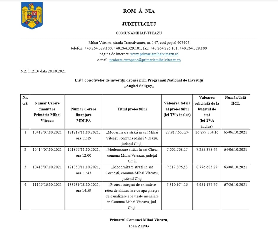 Administrația din Comuna Mihai Viteazu, condusă de Ioan Zeng, a întocmit patru proiecte de dezvoltare care au fost depuse spre finanțare.