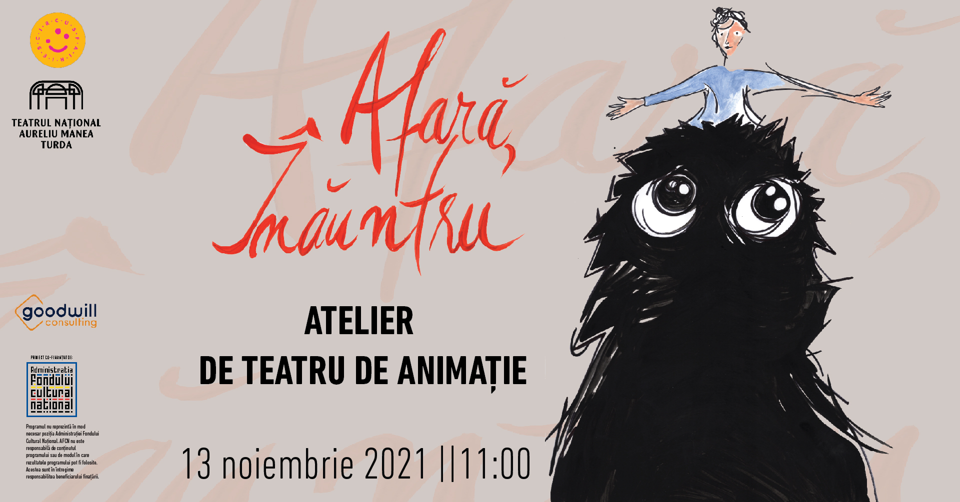 Spectacolul va avea loc vineri, 12 noiembrie, ora 17.00 la Teatrul Național Aureliu Manea (Piața Republicii 52, Turda), iar atelierul de teatru de animație, sâmbătă, 13 noiembrie, ora 11, în același loc.