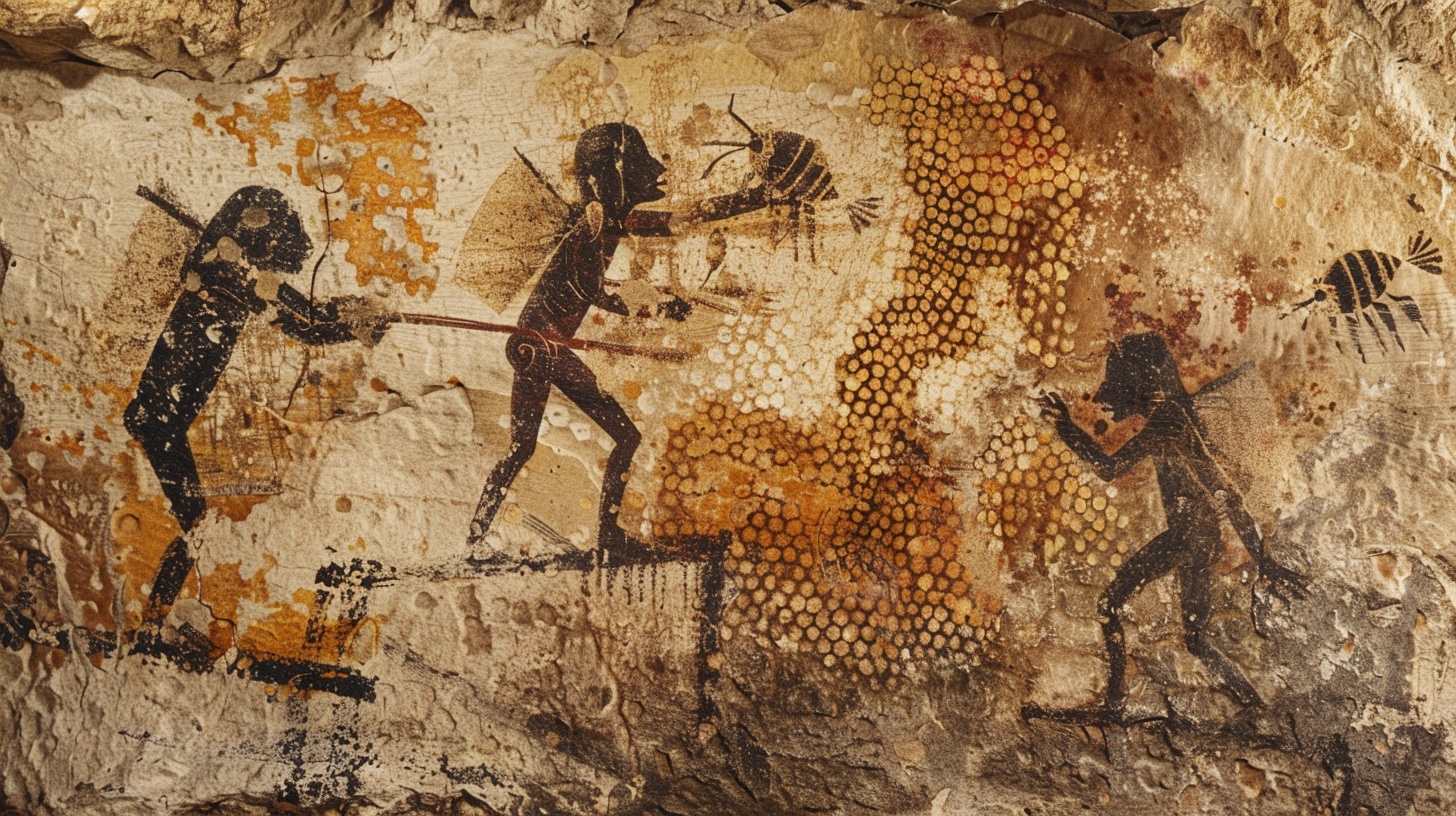 (în imagine este o pictură de pe pereții unei peșteri din Spania care reprezintă culegerea mierii, acum cca. 8000 ani)