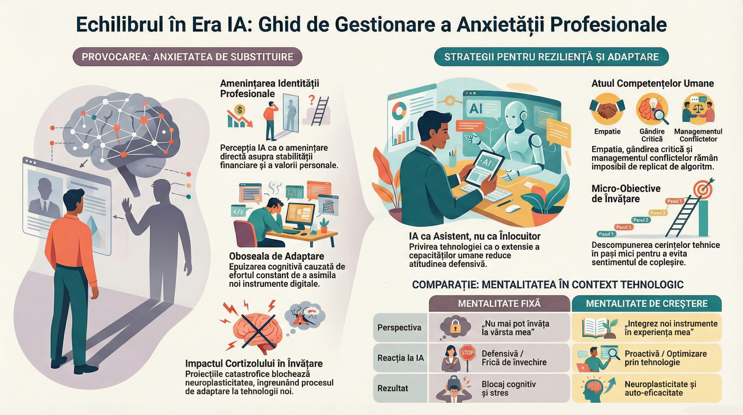 Frica de a deveni irelevant pe piața muncii este adesea alimentată de proiecții catastrofice despre viitor. Trecerea de la o mentalitate fixă („nu mai pot învăța la vârsta mea”) la o mentalitate de creștere („pot integra noi instrumente în experiența mea actuală”) reduce nivelul de cortizol și facilitează neuroplasticitatea.
