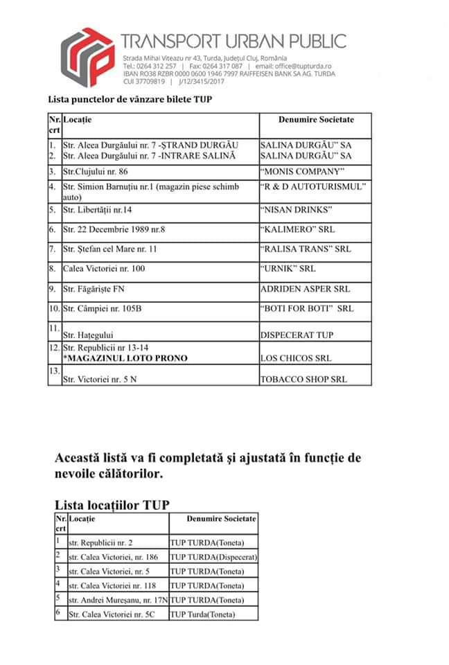 Actualitate Punctele de distribuție TUP Turda ziarul21.ro 23 ianuarie 2020, 21:18 Share Tweet Share Share Email Comments Acestea sunt punctele de distribuție și vânzare a biletelor de călătorie pentru transportul public. Abonamentele se eliberează doar la locațiile TUP, iar programul de funcționare este: LUNI – VINERI 09:00 – 17:00 SÂMBĂTĂ 09:00 – 13:00 DUMINICĂ ÎNCHIS Related Items:Featured, tup Share Tweet Share Share Email Recommended for you Informare privind circulația autobuzelor TUP În atenția călătorilor TUP Autobuzele TUP au fost dezinfectate! 1 Comment 1 Comment Leave a Reply Anulează răspunsulComentariile trebuie să respecte regulile de utilizare.Adresa ta de email nu va fi publicată. Câmpurile necesare sunt marcate cu *Comentariu * Nume * Email * Δ Acest site folosește Akismet pentru a reduce spamul. Află cum sunt procesate datele comentariilor tale.
