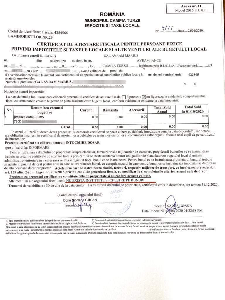Din respect pentru cetățenii și competitorii din cursa electorală vă pun la dispoziție de data aceasta și ,,Cazierul fiscal” 4175 din 02.09.2020, eliberat tocmai de Primăria Câmpia Turzii, prin Serviciul Impozite și Taxe Locale, care spune: NU EXISTĂ INSTITUITE SECHESTRE PE BUNURI, pe numele Avram Marius GAL!