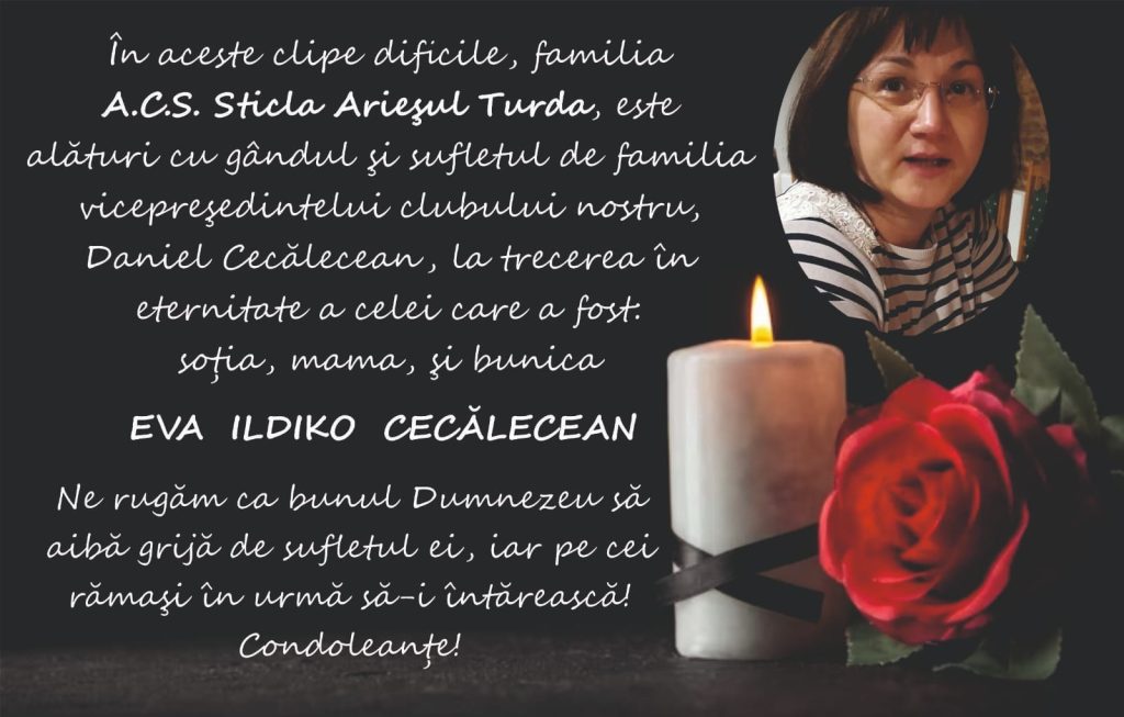 În aceste clipe dificile, familia ACS Sticla Arieșul Turda, este alături cu gândul și sufletul de familia vicepreședintelui clubului nostru, Daniel Cecălecean, la trecerea în eternitate a celei care a fost soția, mama și bunica Eva Ildiko Cecălecean.