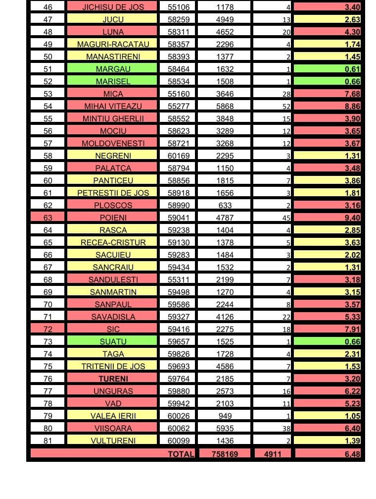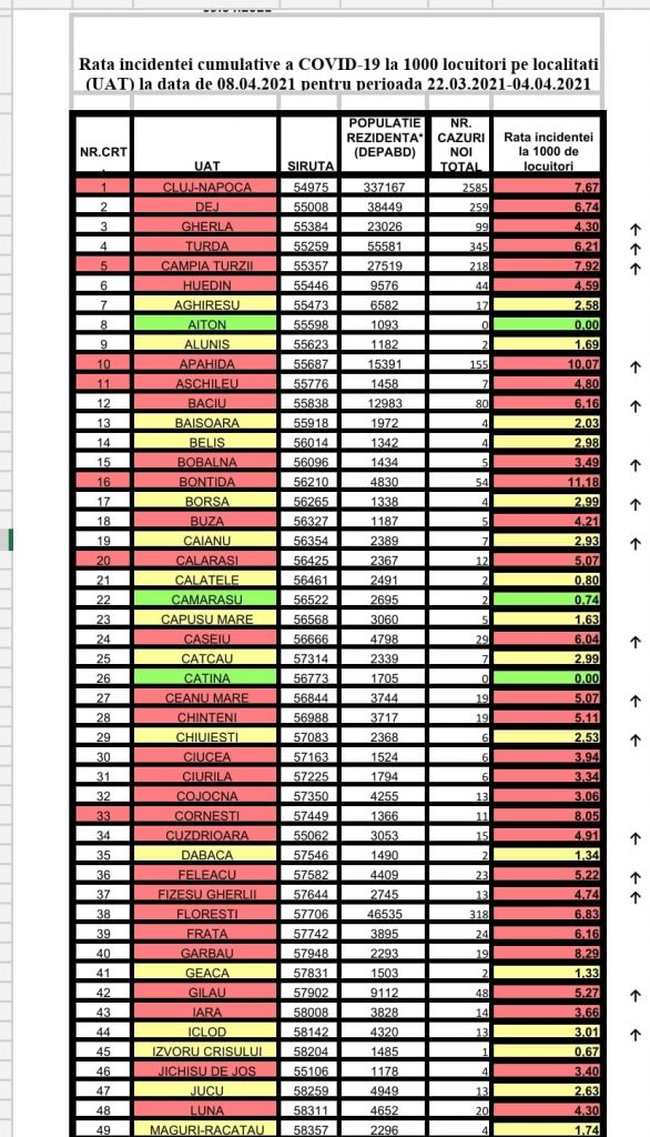 Cum arată rata incidenței comulative a COVID-19 la 1000 de locuitori pe localitățile din județul Cluj pentru perioada 22.03.2021 – 04.04.2021